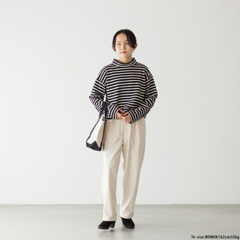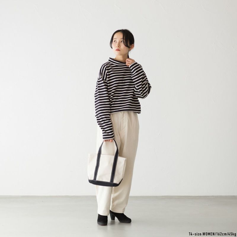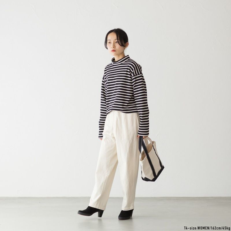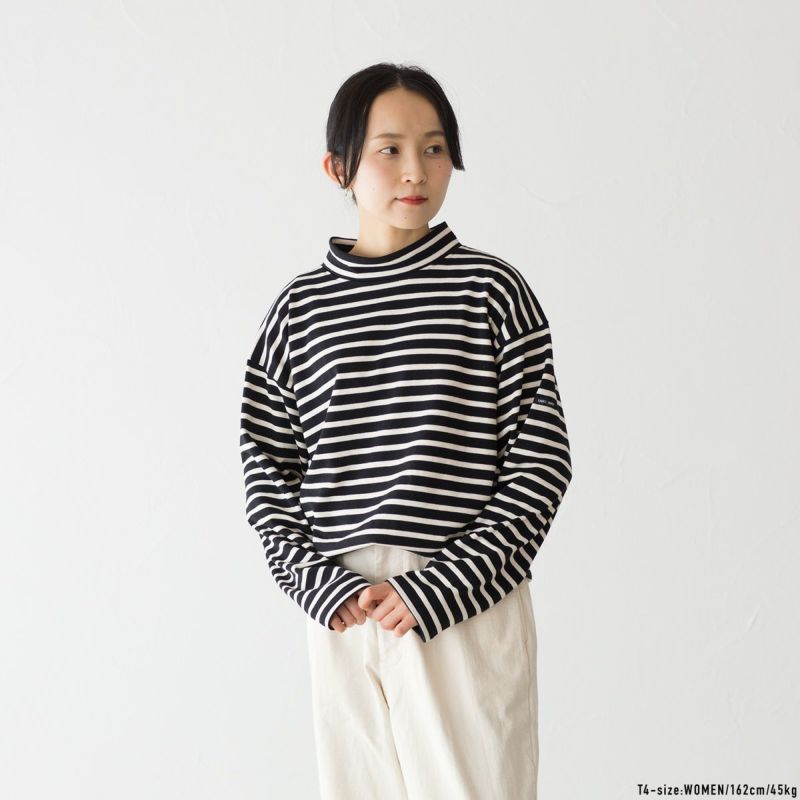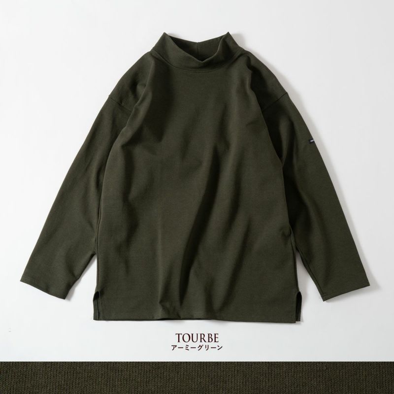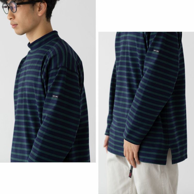 ボートネックをベースにした幅広のモックネック、垂直に取り付けたドロップショルダーの袖、裾の長めスリットなど、レトロで個性的な本格ワークディテールを採用しています。