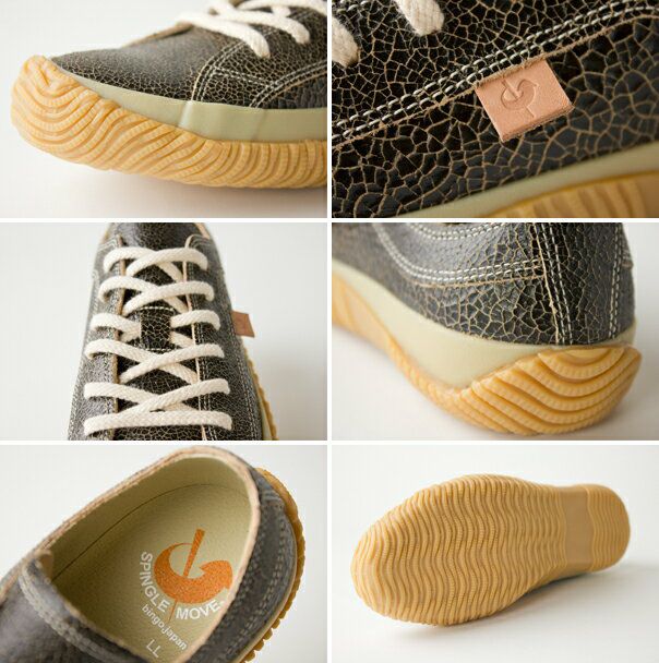 職人の丁寧な手仕事で生み出される純国産スニーカー、スピングルムーヴ。こちらのSPM115はスピングルムーヴのファーストモデルであるSPM101品番をベースに、アッパー素材にビンテージ加工の牛革を使用したモデルです。ベースカラーはブラック。メリハリの効いたクラッキング(ひび割れ)の表情が絶妙です。シルエットは甲を低めに抑えたヨーロピアンタイプ。現代では希少となったバルカナイズ製法で生み出されるソールの形状がデザインポイント。クラフトマンシップの伝わるスピングルらしい一足です。