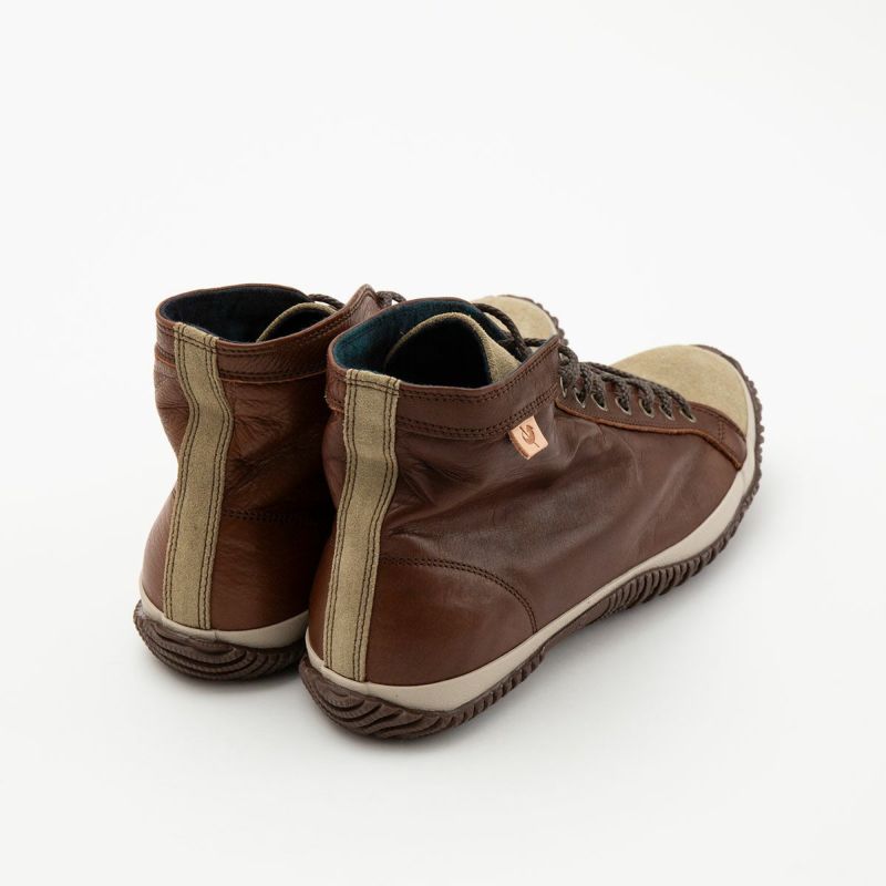 こちらは重厚感あるオイルワックスレザーと上質なスウェードをコンビ使いしたハイカット。オイルワックスレザーは油分を多く含んだ革で、定期的にレザークリームで油分を補給することで、より深くムラ感のある色味へ変化します。