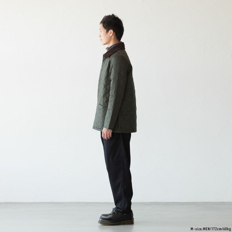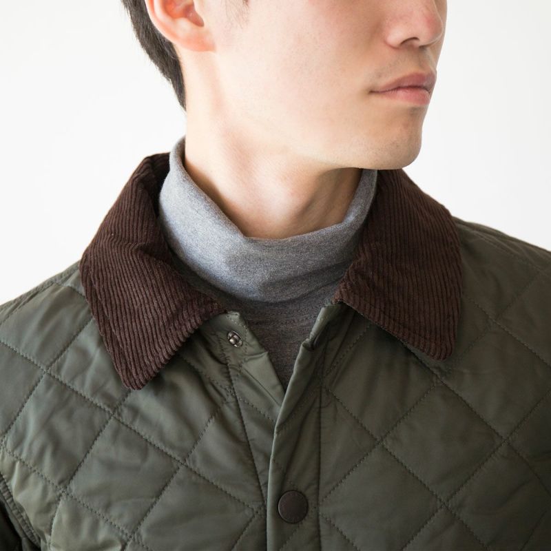 バブアーらしい太めのクラシカルなコーデュロイ襟、滑らかなナイロンシェル、中綿入りキルティングで仕立てた使い勝手のいい軽量アウターです。