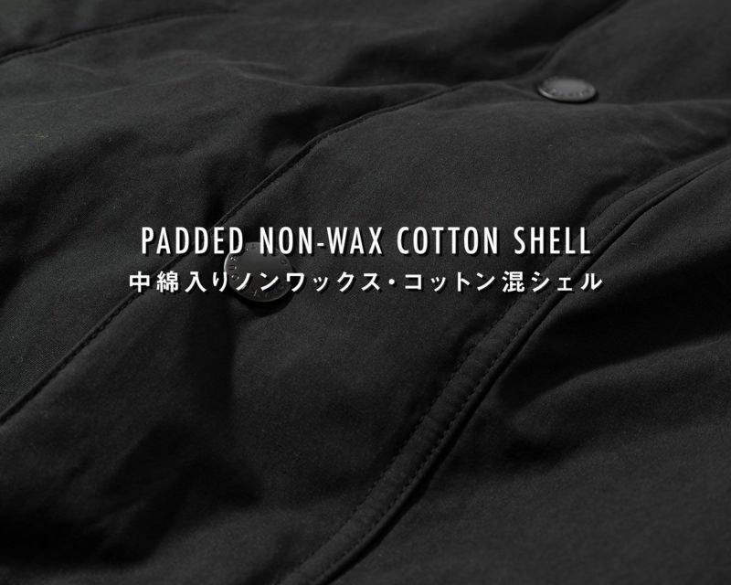 ワックスコットンの風合いを再現した、手入れ不要のコットンナイロンと、保温力抜群なポリエステルの中綿を組み合わせた軽量素材。