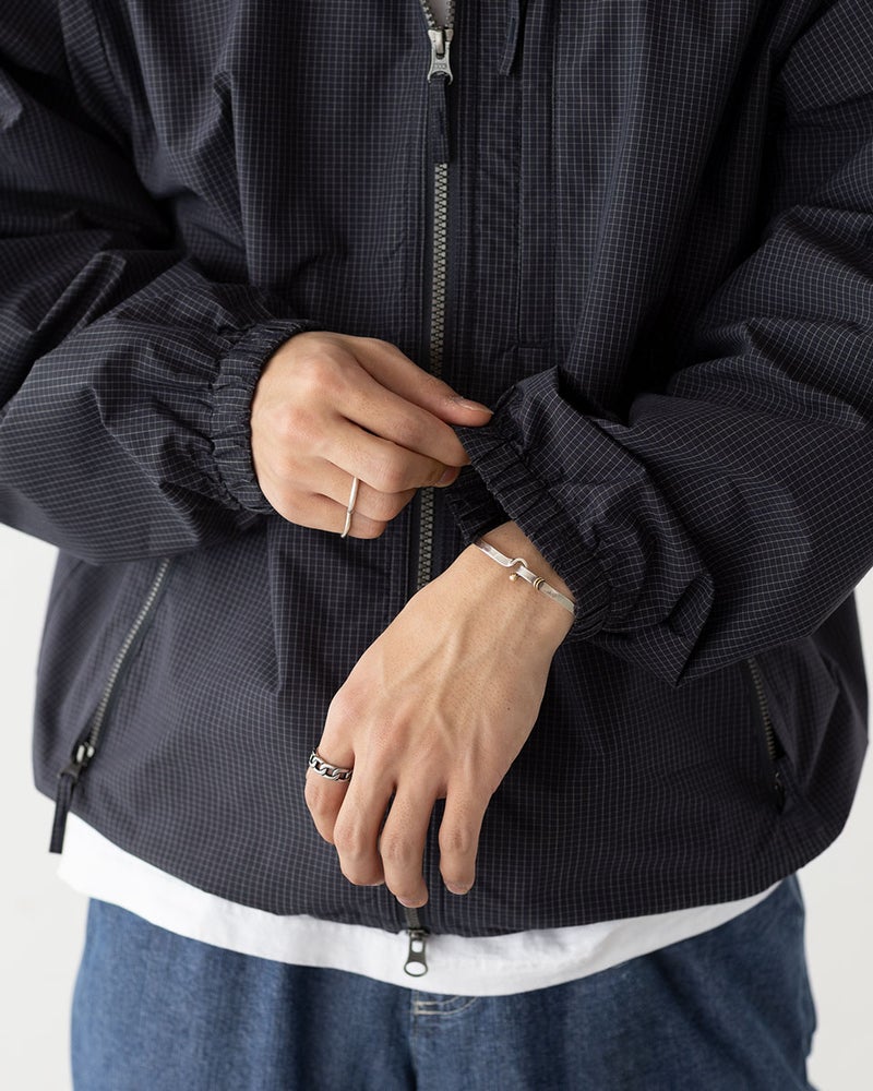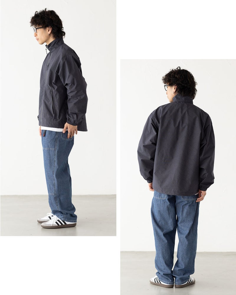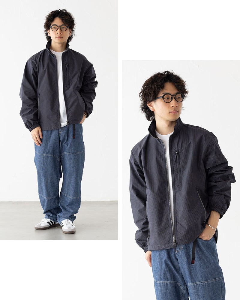 レトロなチェック柄を現代的に落とし込んだデザインが特徴のウインドジャケット。程よいボリュームのスタンドカラーが首元をしっかりカバーします。