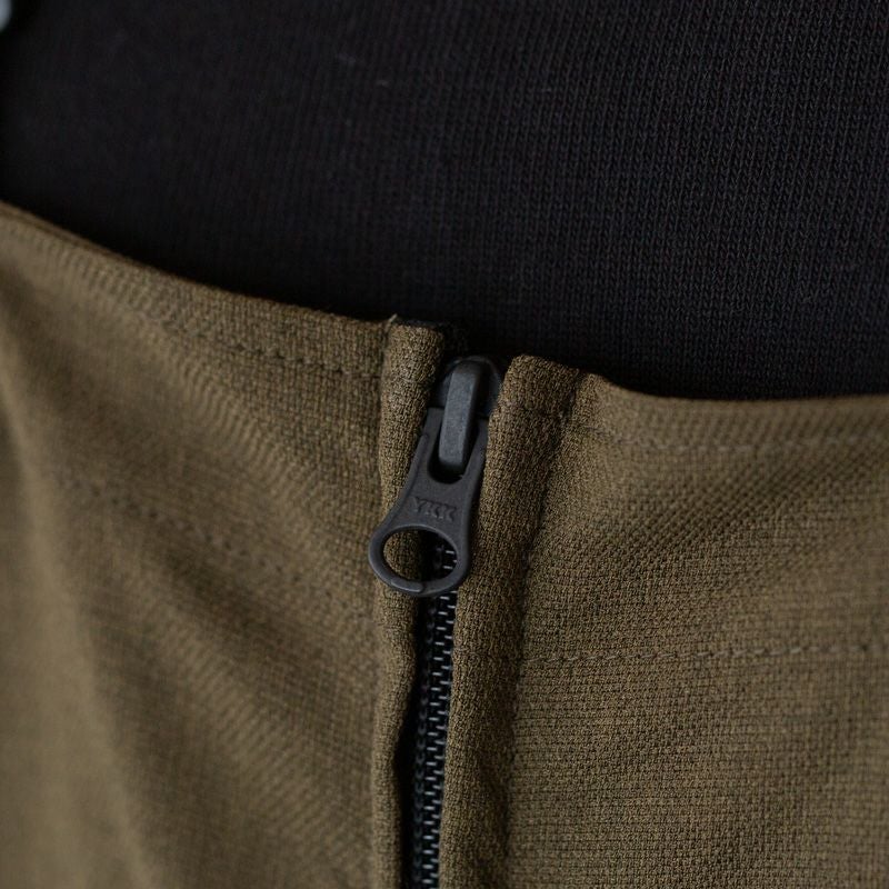 ウエスト部分はゴム仕様になっているので着心地楽チン。広がりすぎずストンとしたシルエットで着痩せ効果も◎。前はダブルジップ仕様で上下開け閉め可能、後ろスリット入りで足さばきもよくアクティブに動きやすいアイテムです。