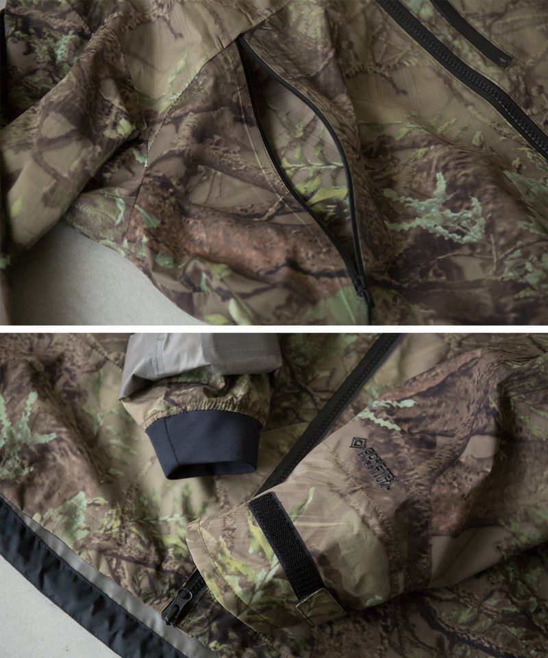 フードには、ビューアップシステム/フードベンチレーションを搭載し、安全な視界を確保すると共にフード内の蒸れとバタつきを軽減。またポケット内部にもベンチレーション機能を設け、衣服内の通気性も確保。袖口は水の浸入を軽減する2重袖口仕様。フロント以外の各サブポケットには止水ファスナーを採用し、衣服内やポケット収納物の濡れを最小限に抑える。