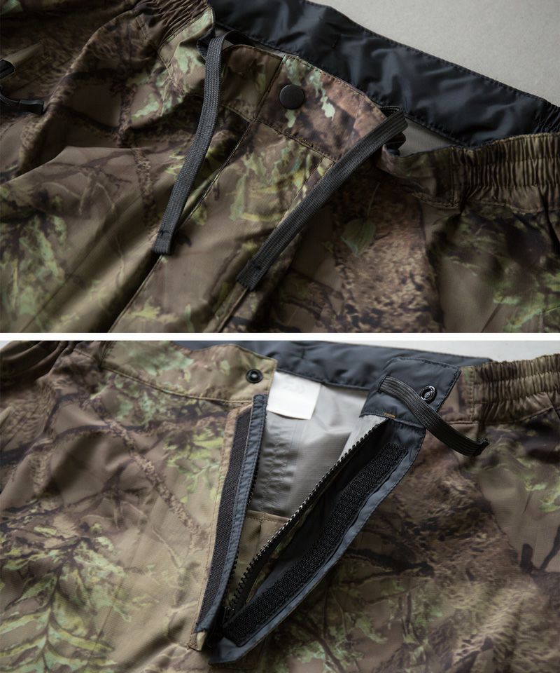 パンツのウエストにはサイズ調整用コードを装備。ウエストのフィット感を調整可能。パンツポケットから水の浸入を軽減する止水ファスナー。収納物の濡れを最小限に抑える。フロントファスナーからの水の浸入を防止する三角マチを搭載。履物に合わせて裾幅を調整可能なブーツカットファスナーを裾部分に搭載。
