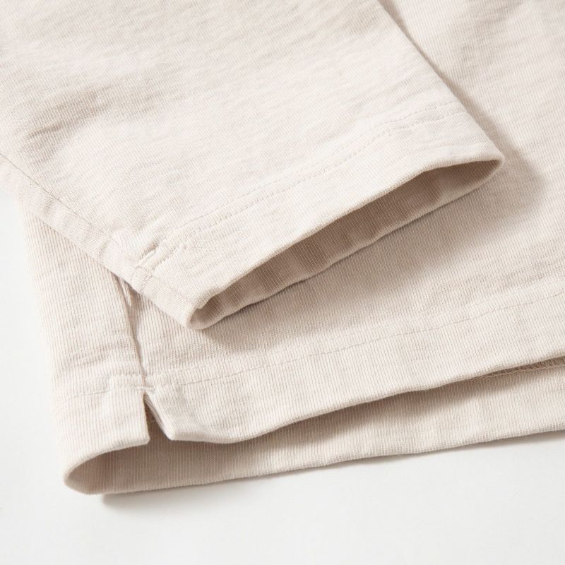 ボディには「ジャックマン」ならではのドツメ天竺生地を採用。均等に度目が詰まるという吊り編み機の利点を生かし、一般的なTシャツ生地の約2倍の糸を極限まで詰めて編み立てています。非常に耐久性があり、生地表面の凹凸感も独特です。