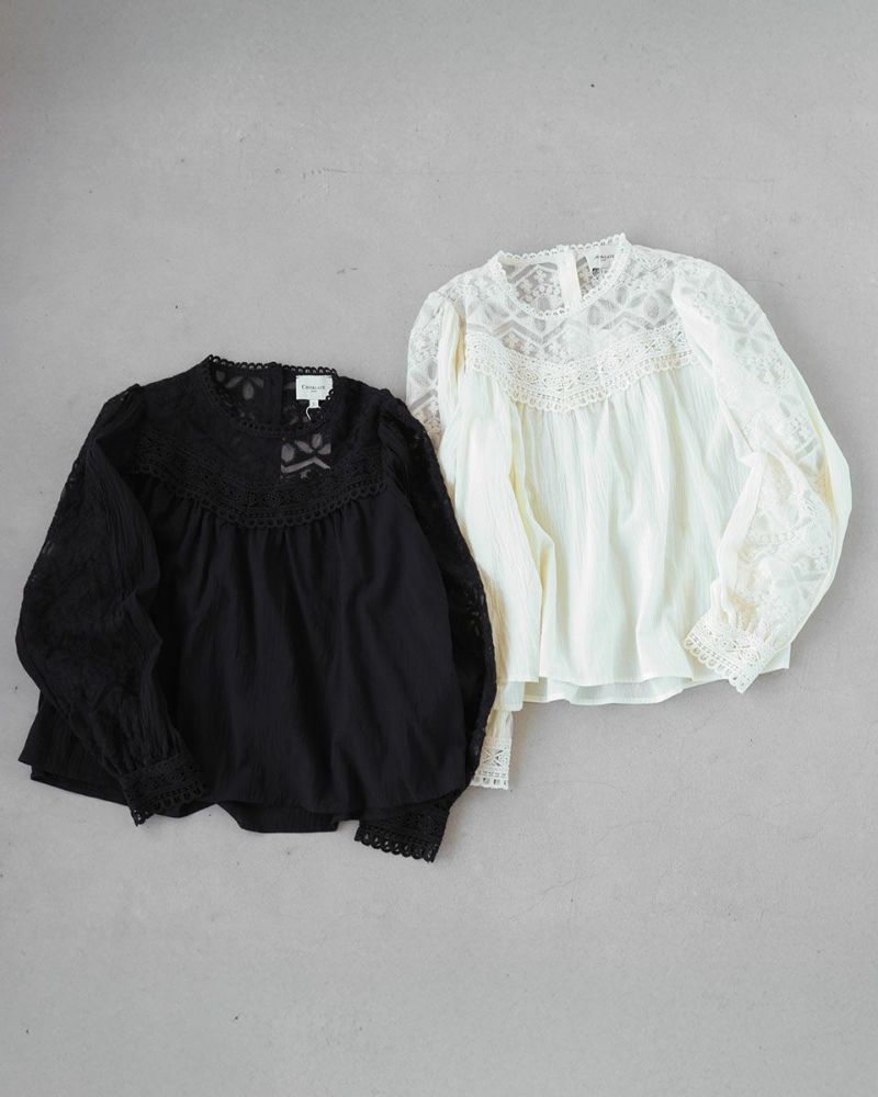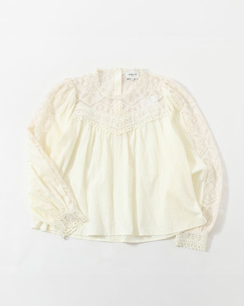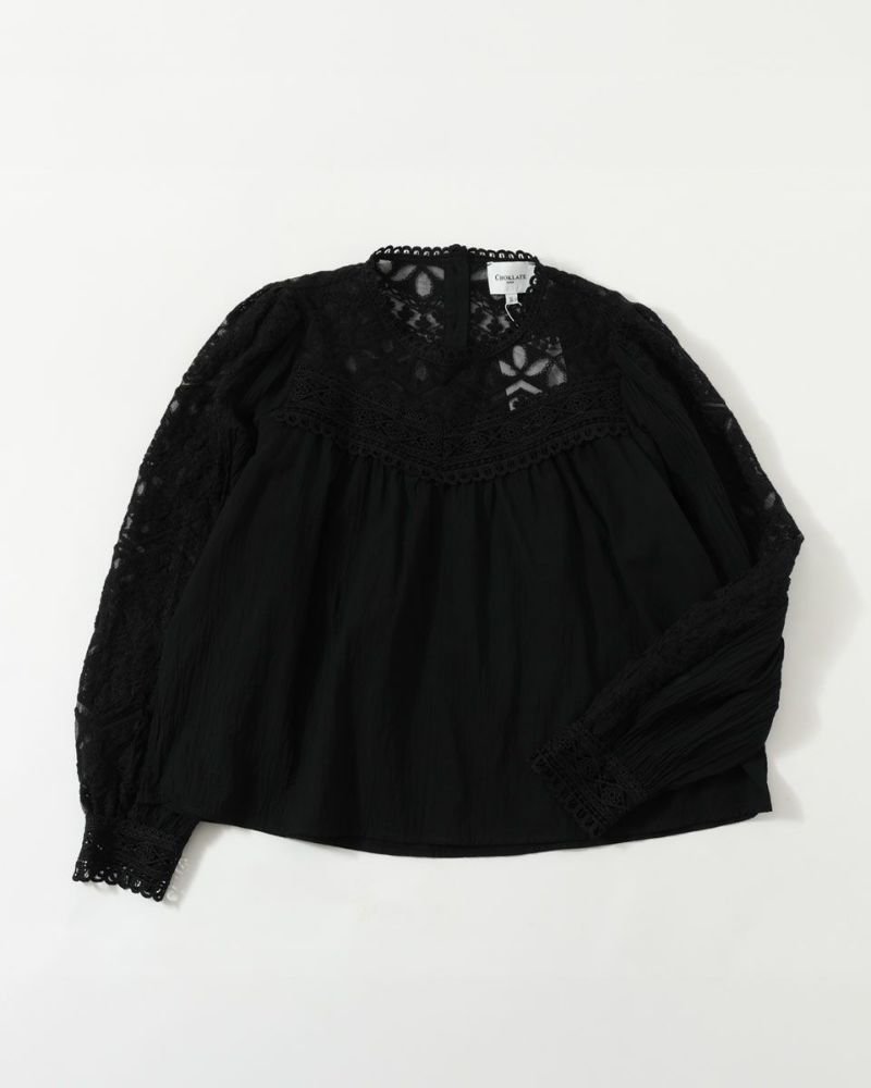 繊細なレースをあしらった「CHOKLATE PARIS / チョコレートパリ」のブラウスは、女性らしさを引き立てながらも甘さを抑えた一枚。ヨーク部分や袖に透け感のあるレースを使用し、軽やかで上品な雰囲気を演出してくれます。