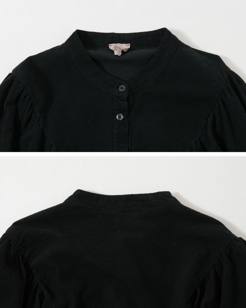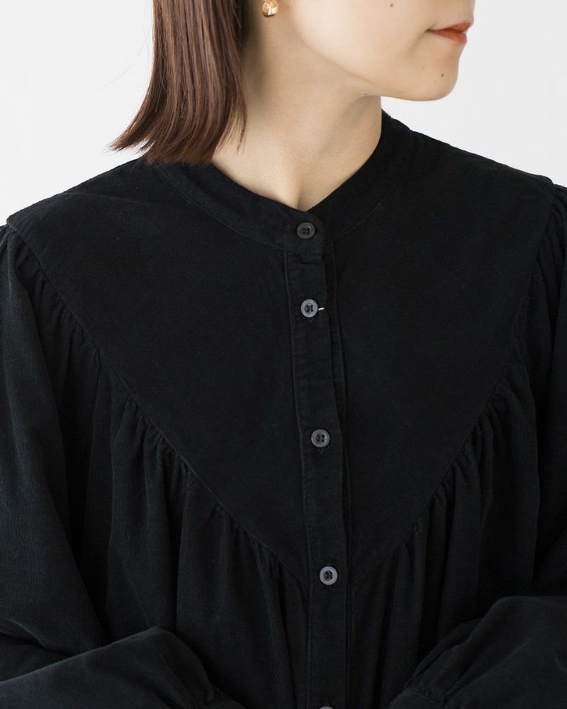 こちらは細やかな畝が上品な表情を生み出す、細畝コーデュロイ素材のノーカラーブラウスです。