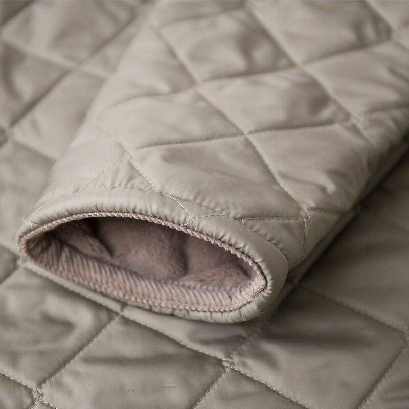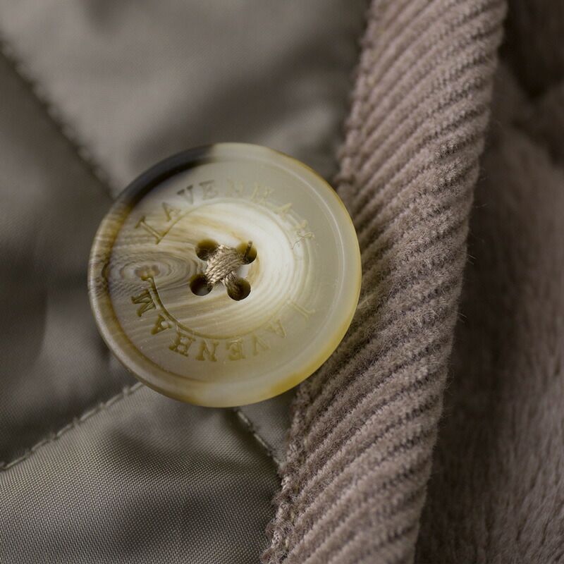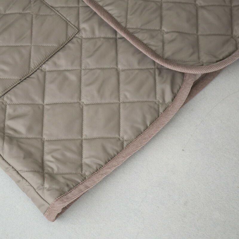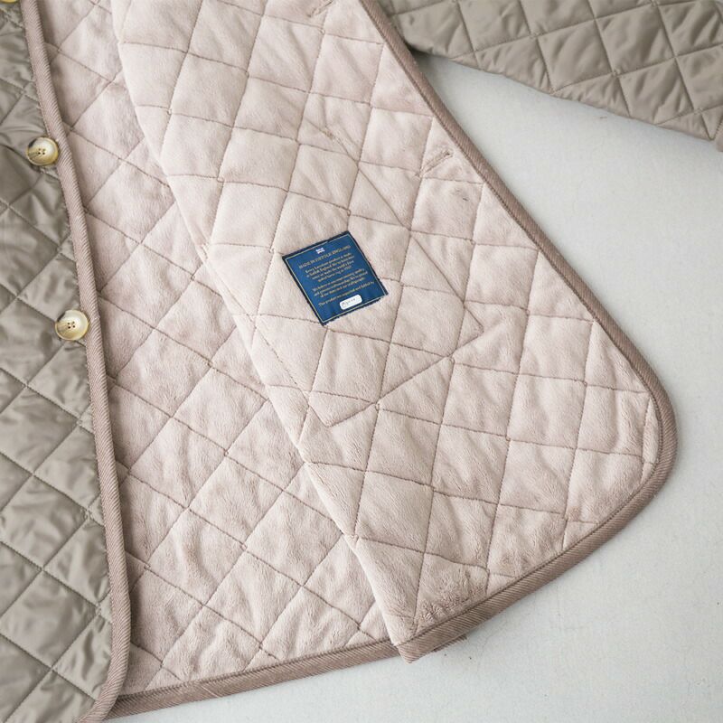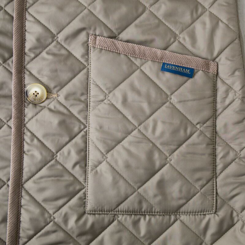 美しいダイヤモンドキルト、クラシカルなボタン留めのフロント、コーデュロイのパイピングで仕上げた正統派スタイル。