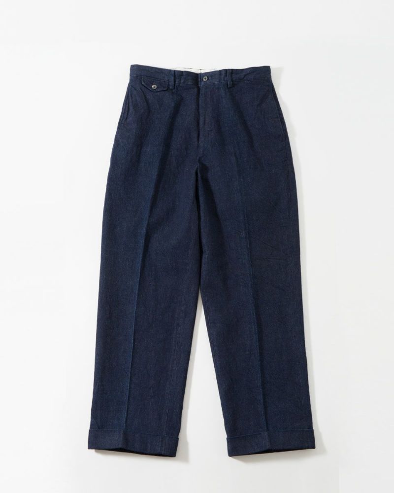 同素材のテーラードジャケットと対になる、国産デニムで仕立てた男前トラウザーズ。スーツ組下の役割を持ちながらも、単品使いではジーンズのように育てる喜びを味わえる逸品です。