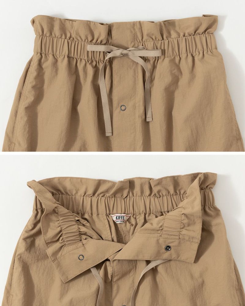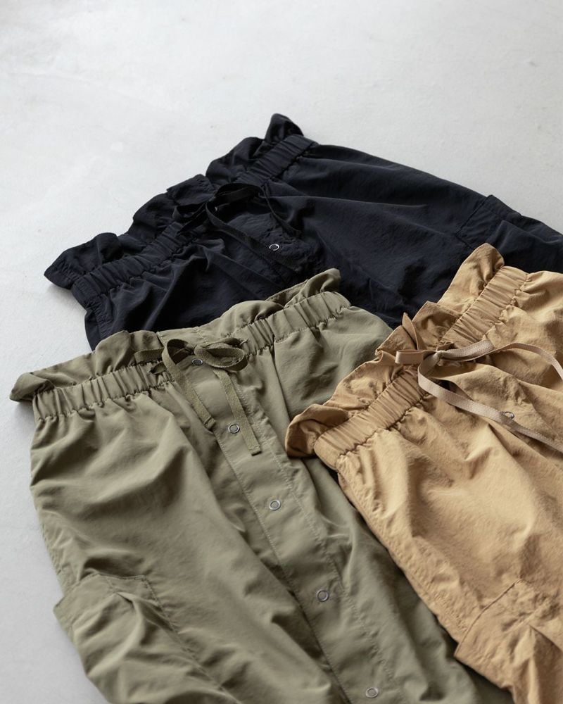 ウエストに配したリボン状のドローコードやサイドのポケットなど、ミリタリー由来のディテールは機能性抜群。コーデのアクセントになりつつも普段のコーデによく馴染むアイテムに仕上がっています。