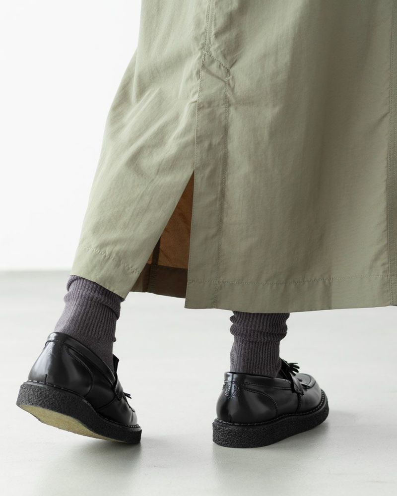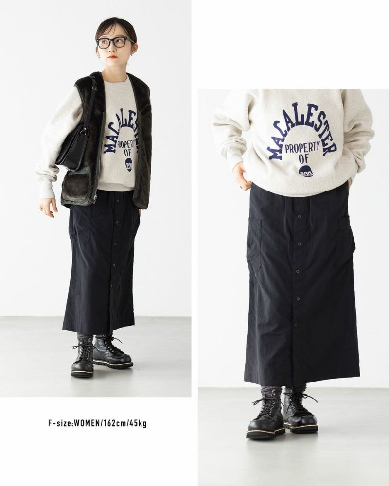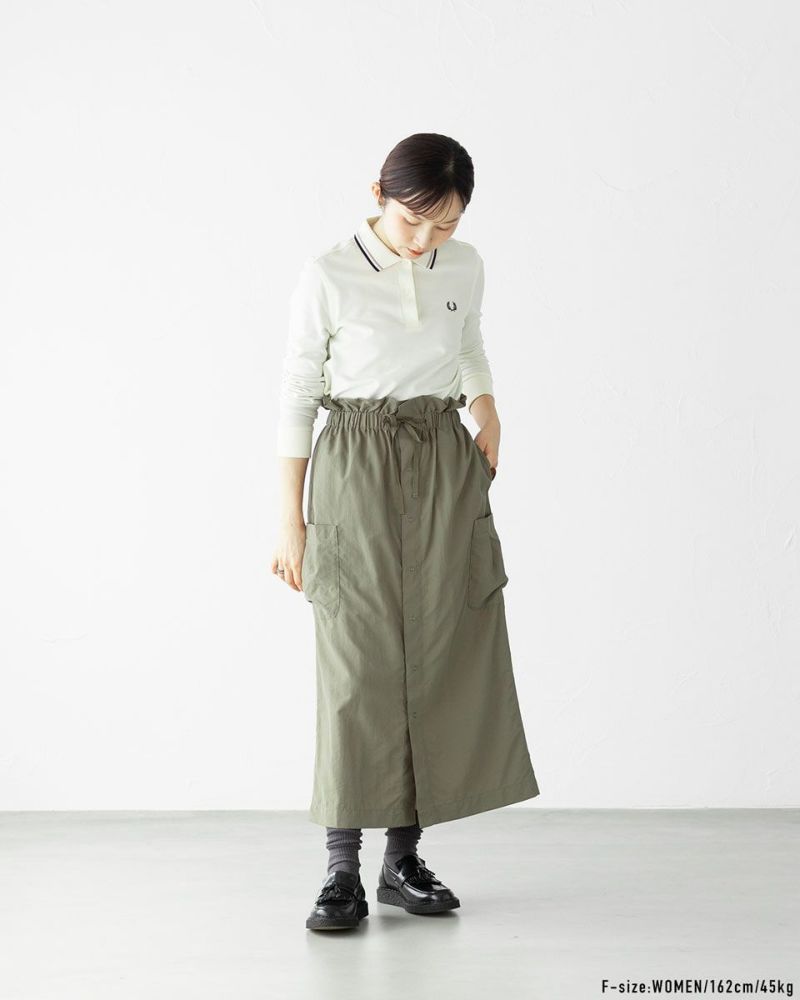 軽く柔らかい生地は長時間の着用でも楽々な快適性。ロングスカートでありながら前後のスリットで動きやすいのが嬉しいですね。