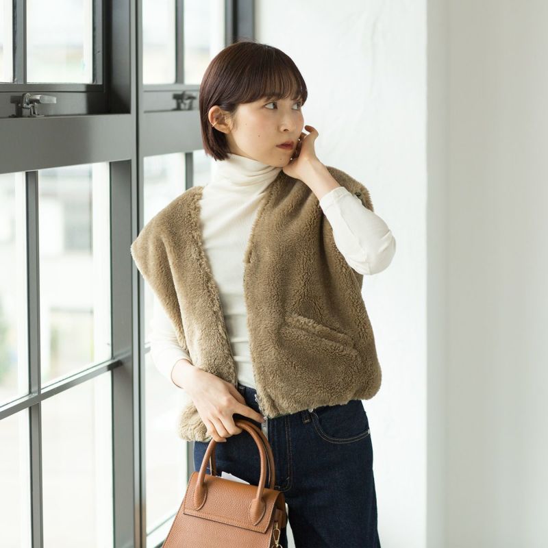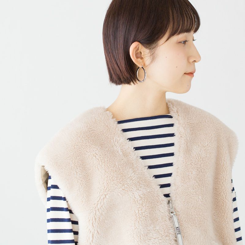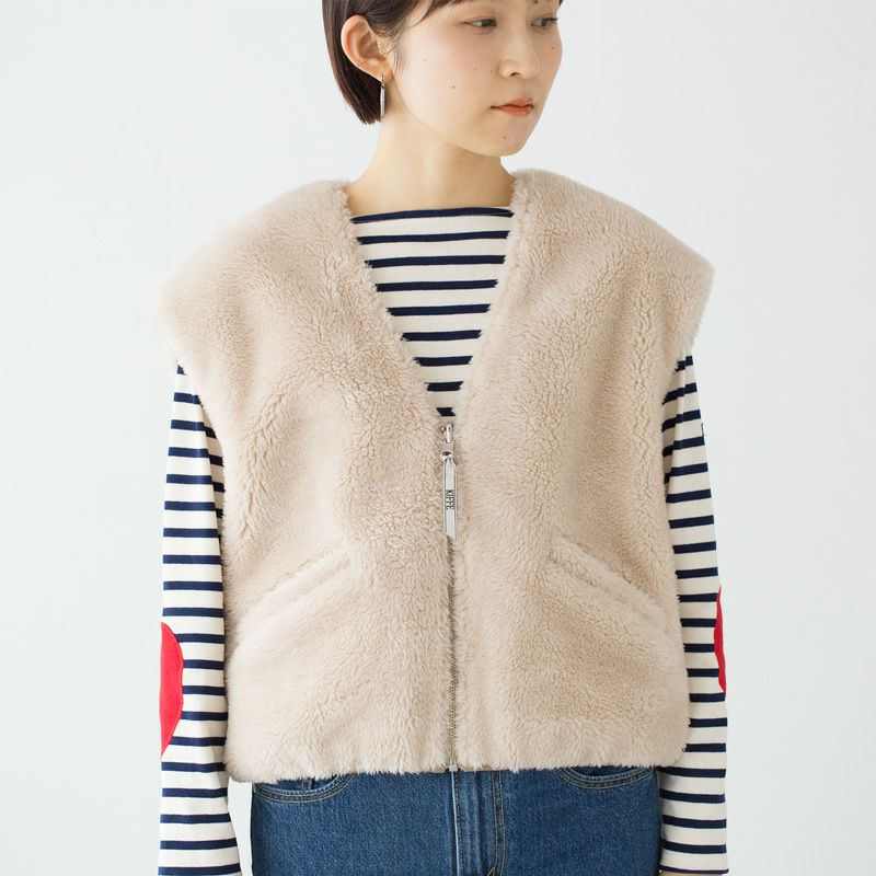ゆったりめの身幅とアームホールで、厚手のニットやトレーナーの上にも重ね着OK。長いシーズン愛用できる着まわし力抜群のショートベスト、いかがでしょうか。