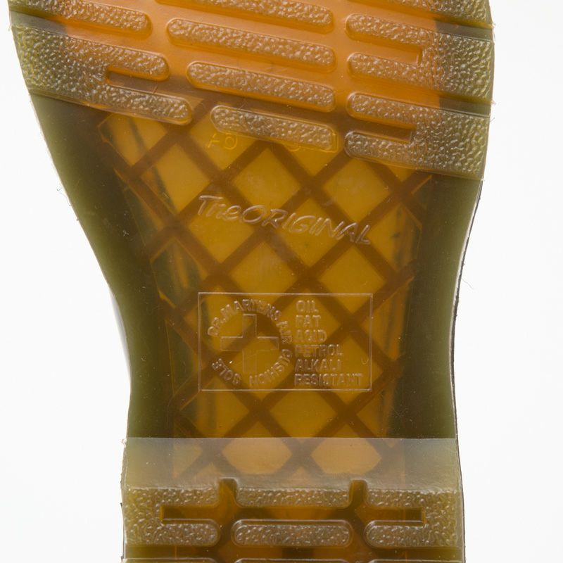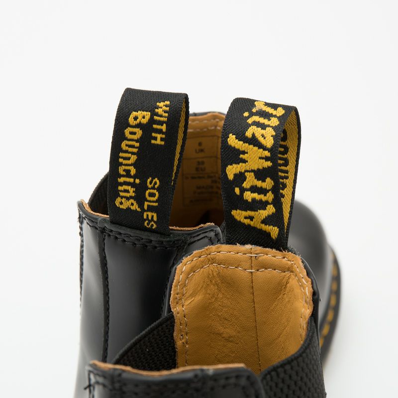こちらはDr.Martensの象徴的なディテール、イエローステッチ入りの定番サイドゴアブーツです。ロゴ入りのヒールループやDMSソールもしっかり主張。脱ぎ履きする時にゴムバンドが伸びるので脱ぎ履きが楽なのも特徴です。