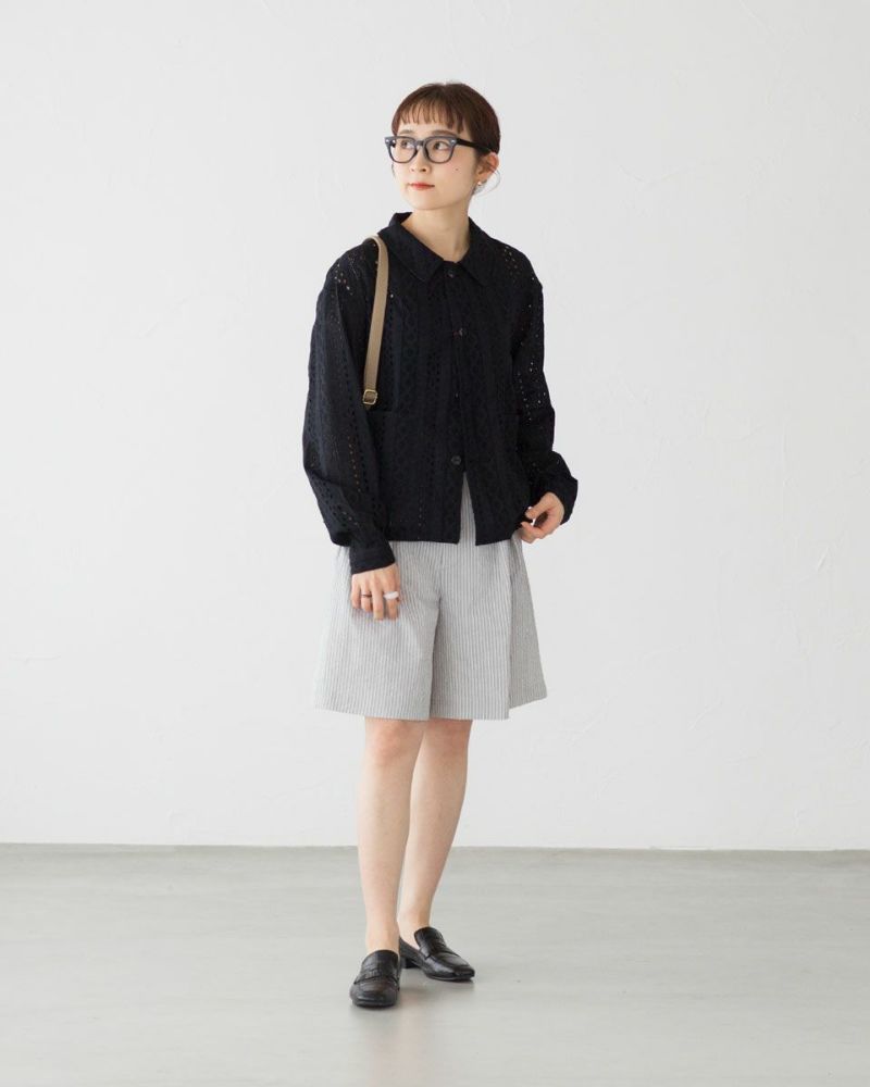 モデル着用感はドロップショルダーで全体的にゆったりめ。長袖インナーの上にも楽々羽織れるサイズ感ながらもカジュアルすぎず、レディーライクに着れるシルエットに仕上がっています。