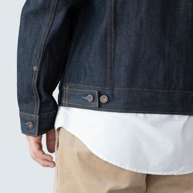 胸にボタンが2つ、左右にサイドアジャスターの付いた所謂3rdタイプデニムジャケットのベーシックなディテールです。セルビッチのデニムジャケットには珍しく、サイドポケットもついています。