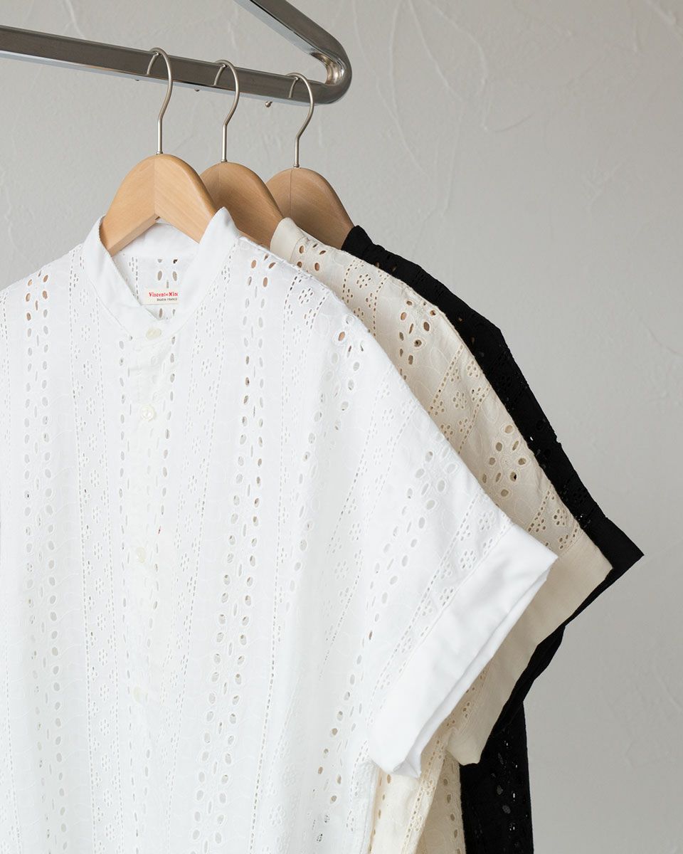 ヴァンソンエミレイユ オープンカラー シャツ Vincent et Mireille VM251IN11032 ブラウス レディース 総刺繍 コットン シアー シースルー 前開き